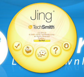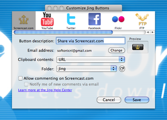 De interface van Jing is even wennen. Bovenin het scherm huist een zonnetje, dat je aanklikt om knopjes te zien. Hier vind je uiteraard de opnameknop maar ook het ietwat omslachtige optiemenu. In dit venster wissel je bijvoorbeeld de online deelfunctie door naar Preferences en dan 'Customize Jing Buttons' te gaan. Je treft bijzonder veel deelfuncties aan, waaronder YouTube, Twitter, Facebook, Flickr of TechSmith's eigen service Screencast.com.